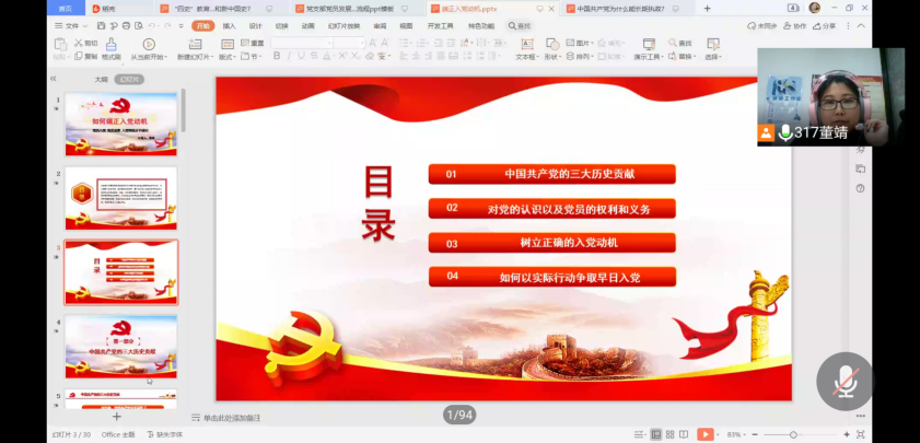首先,程欣慧老师向新生介绍中国共产党的三大历史贡献,特别是党的十八大以来,以习近平同志为核心的党中央团结带领全党全国各族人民,统筹推进“五位一体”总体布局、协调推进“四个全面”战略布局,全面开创中国特色社会主义事业新局面,推动党和国家事业发生了历史性变革、取得了历史性成就。随后,程老师向各位新生讲解对党的认识以及党员的权利与义务,要求新生认真学习党的性质、宗旨、党的历史以及入党流程。最后,程老师要求同学们明确参加党课学习的目的,树立正确入党动机,永远保持与时俱进的状态,以实际行动争取早日入党。