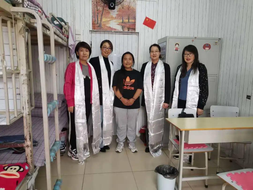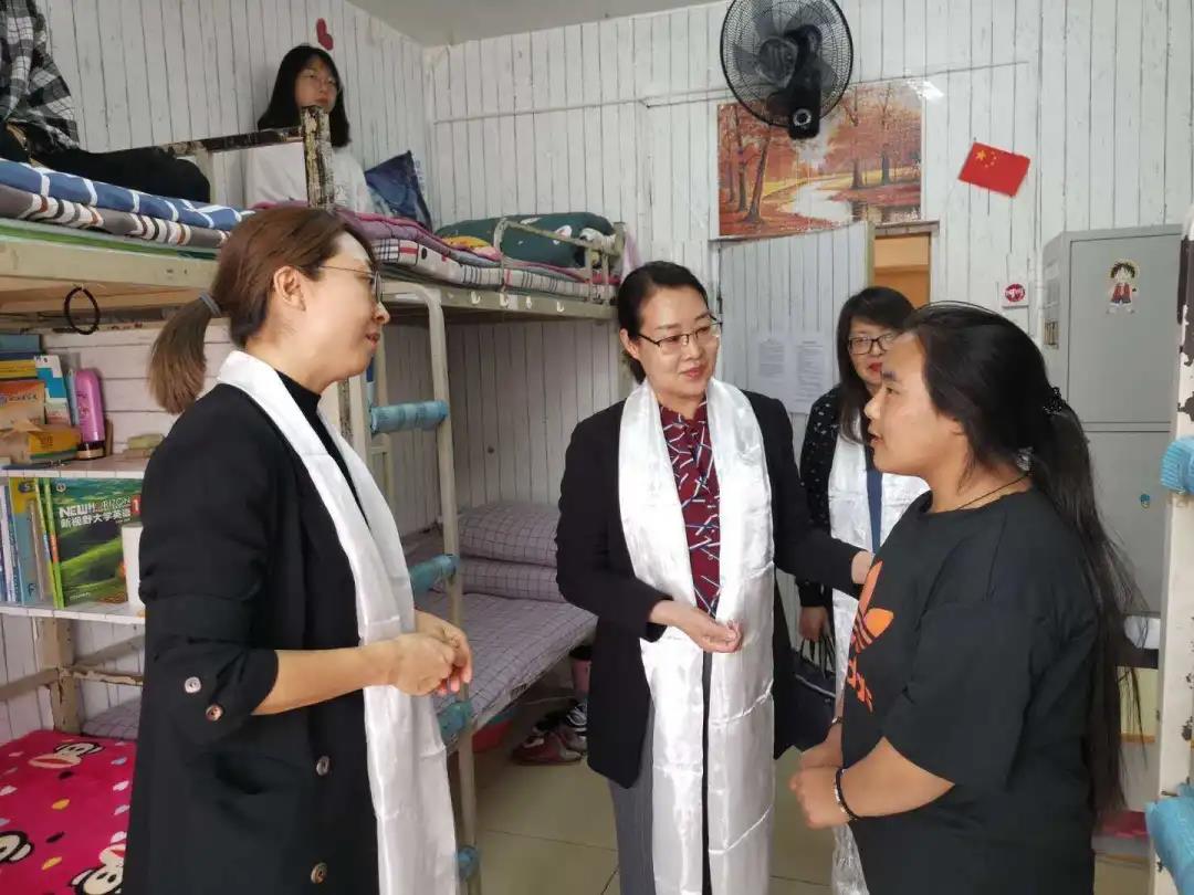 在走访藏族学子寝室过程中,郭院长亲切地询问了他们的学习和生活情况和存在的困难,鼓励同学们认真思考“参加高考为什么,到了大学干什么,离开大学有什么”,鼓励他们把个人的理想追求融入国家和民族事业,今后为国家和家乡的发展做出贡献。叶琳书记还亲切地提醒同学们合理安排生活时间,鼓励不同民族同学之间相互学习、相互帮助,珍惜缘分和大学美好的学习时间。为表示对老师们的感谢,同学们按照当地习俗为老师们敬献了哈达,并表示在今后的学习生活中,会不断提高自身综合素质,努力学好本领,在奋斗中实现人生价值。
