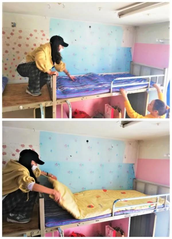 为了给新生营造回家的氛围,志愿者们主动帮助新生们整理床铺。他们的热情消除了新同学对环境的陌生感,让新生感受到了来自大学的第一份温暖,也让家长放心。