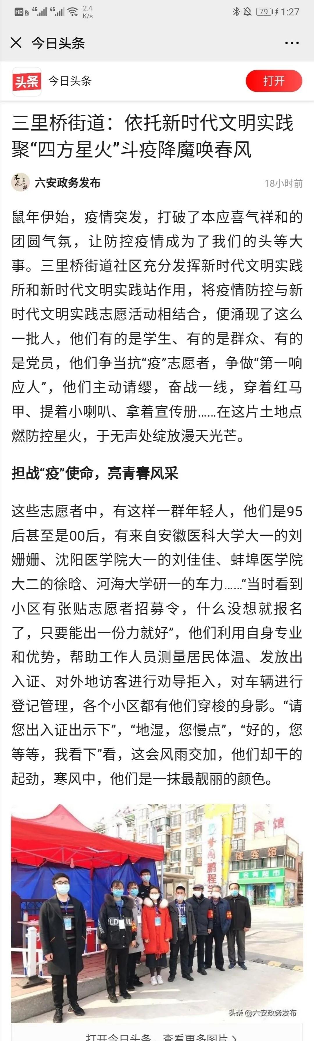 2020年2月29日,六安政务在《今日头条》上为一群年轻人点赞。他们争当抗“疫”志愿者,争做“第一响应人”,他们主动请缨、奋战一线,穿着红马甲、提着小喇叭、拿着宣传册……其中就有来自米兰milan官方网站基础医学院的刘佳佳同学。