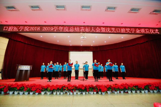沈美口腔李东白院长宣读了《关于颁发第三批沈美口腔奖学金的决定》,汪宣科总经理向获奖学生表示了祝贺,希望获奖同学珍惜荣誉,继续努力,将这份爱与责任传递下去。沈美口腔领导向21名同学发放了企业奖学金。三年来,沈美口腔累计在口腔医学院发放3批共计5.1万元企业奖学金,共有51人次学生获奖。大会在全体师生合唱《我和我的祖国》中结束。