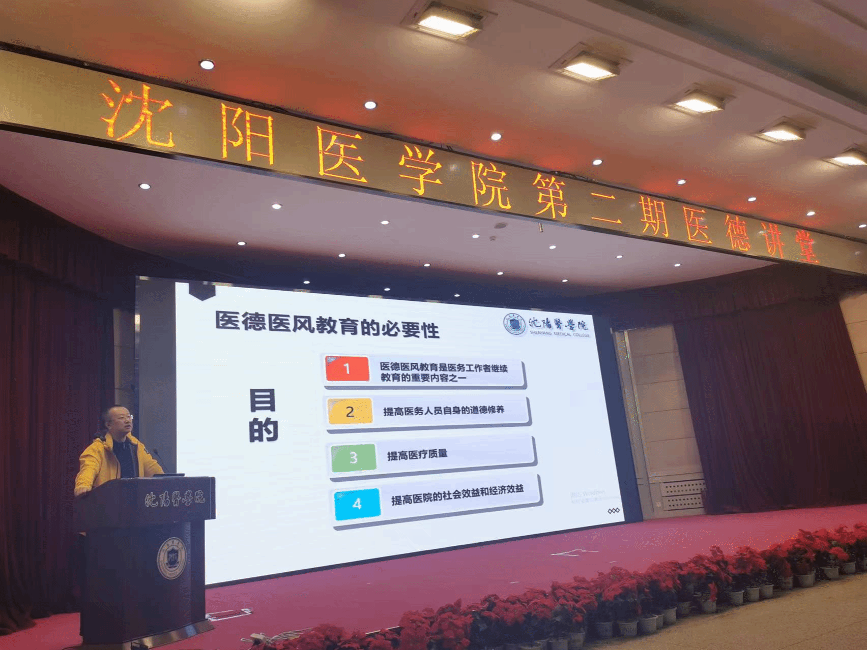 面向大一学生,教务处邀请附属医院临床专家,开展“医德讲堂”活动。孙艺教授、张汝峰教授、吴桂平教授、郭欣宇教授等专家分别从名医名家事例和工作经验等角度生动地讲述了新时代沈医人团结拼搏、奋勇前行的故事,勉励广大学生赓续优良传统,树立正确的世界观、人生观、价值观,遵纪守法,恪守医德,廉洁行医,文明服务,构建和谐医患关系。