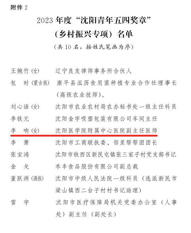 “沈阳青年五四奖章”是共青团沈阳市委员会、沈阳市青年联合会授予沈阳优秀青年的最高荣誉,旨在表彰在社会主义现代化建设中作出突出贡献的优秀青年。近日,共青团沈阳市委员会和沈阳市青年联合会下发了《关于2023年度“沈阳青年五四奖章”选树活动的表扬通报》(沈团联发[2024]6号),米兰附属中心医院副主任医师李响同志荣获2023年度“沈阳市青年五四奖章”(乡村振兴专项)。