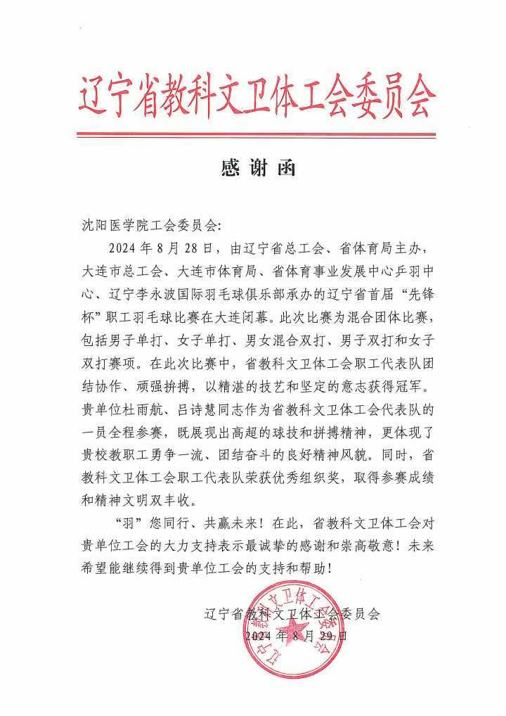 8月28日,由省总工会、省体育局主办,大连市总工会、大连市体育局、省体育事业发展中心乒羽中心、辽宁李永波国际羽毛球俱乐部承办的辽宁省首届“先锋杯”职工羽毛球比赛顺利闭幕。米兰体育教学部青年教师杜雨航、吕诗慧应辽宁省教科文卫体工会委员会邀请,作为省教科文卫体工会代表队的队员全程参与此次比赛,并取得冠军。