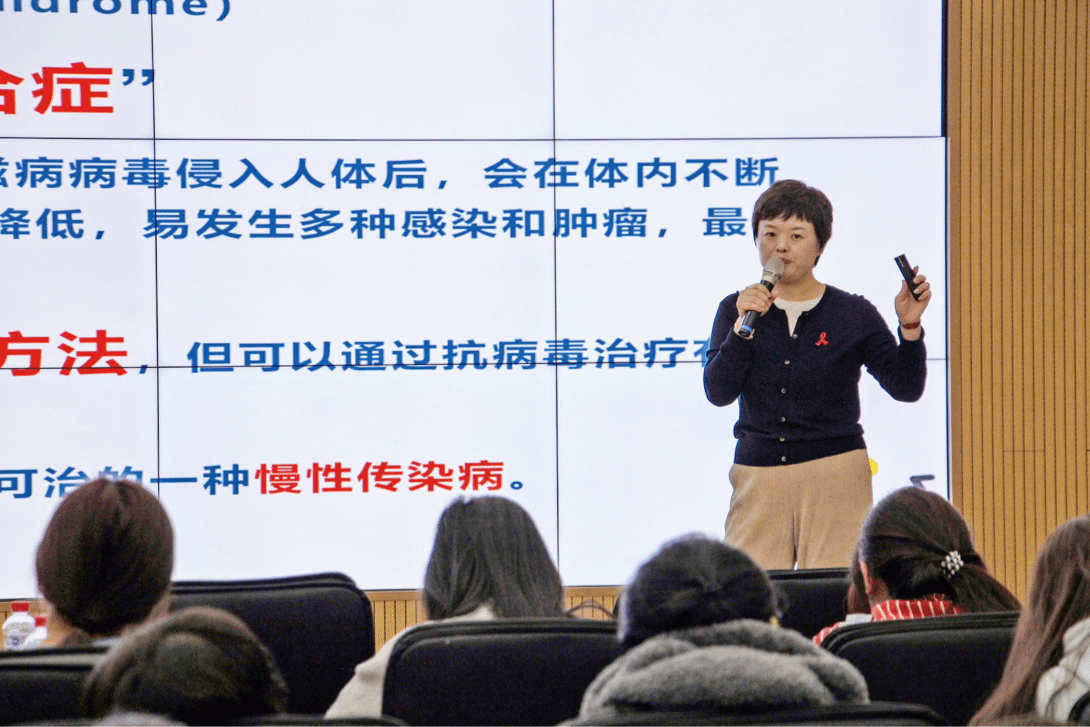 接着,沈阳市疾病预防控制中心(沈阳市卫生监督所)性病与艾滋病防制部副部长穆金萍做防艾专题讲座,她以深入浅出的方式,结合生动的案例和详实的数据,向学生们讲解了艾滋病的传播途径、临床表现及防治措施等知识。她特别指出性传播、血液传播和母婴传播是艾滋病的三大主要传播途径,提醒大家保持健康的生活方式,远离高危行为,呼吁每一位师生都积极参与到防艾事业中。