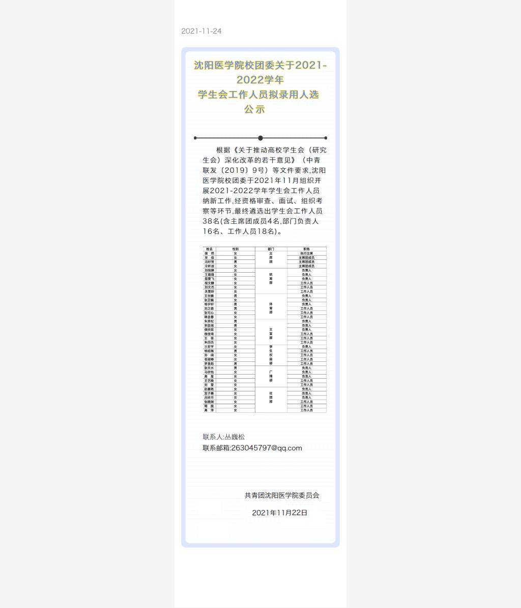 米兰milan官方网站校团委关于2021-2022学年学生会工作人员拟录用人选公示