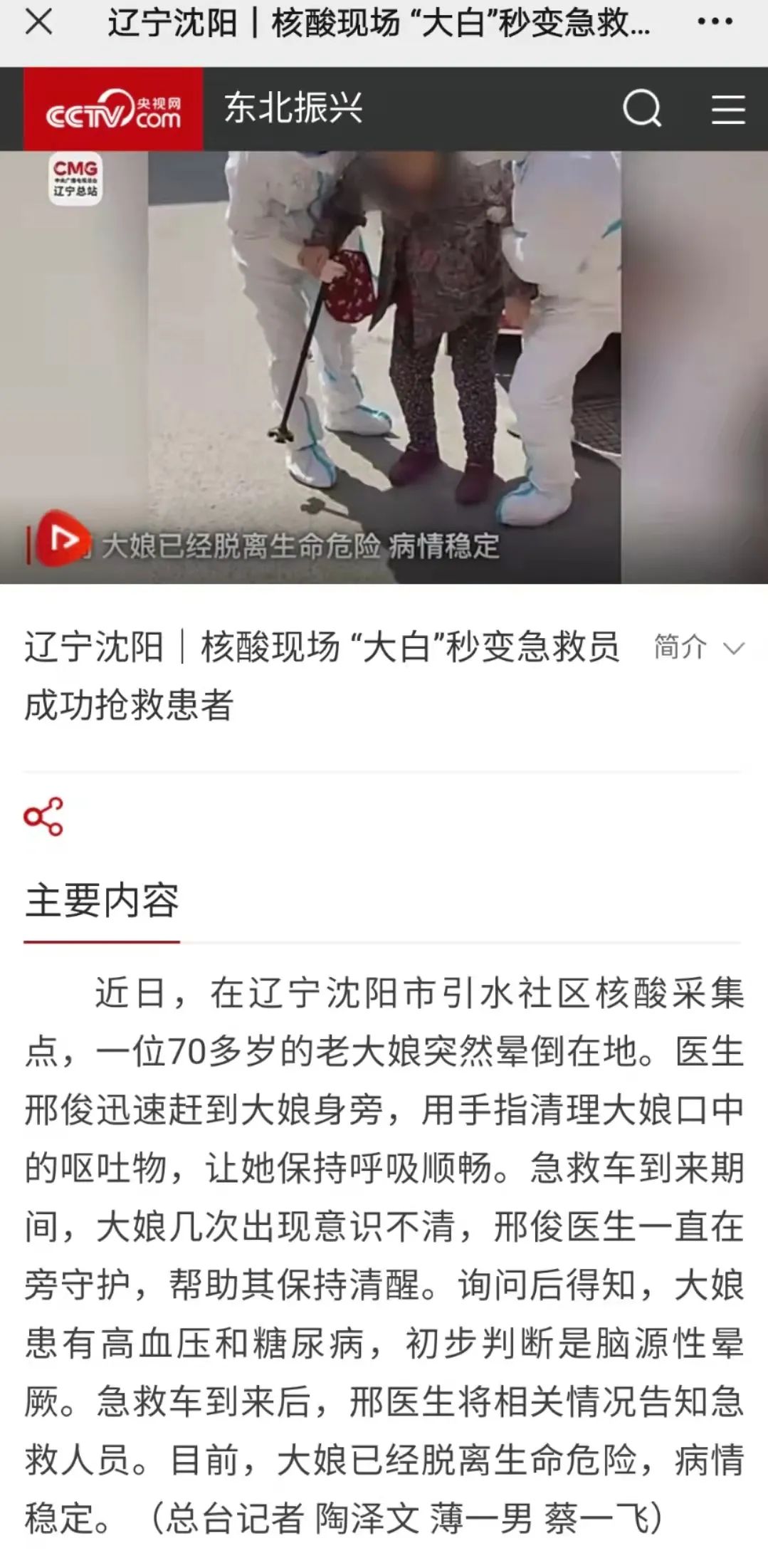 央视网报道辽宁省退役军人总医院.米兰milan官方网站附属二院邢俊医生救人事迹