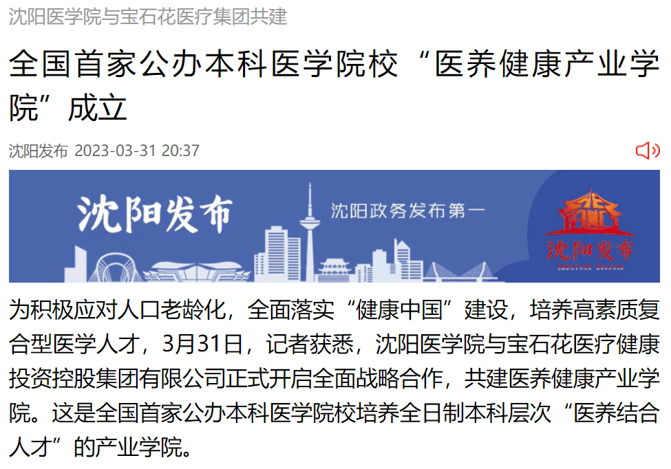 沈阳发布:米兰milan官方网站与宝石花医疗集团共建 全国首家公办的本科医学院校“医养健康产业学院”成立