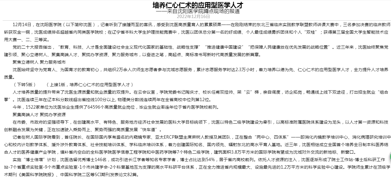 沈阳日报:培养仁心仁术的应用型医学人才——来自米兰milan官方网站蹲点现场的报道