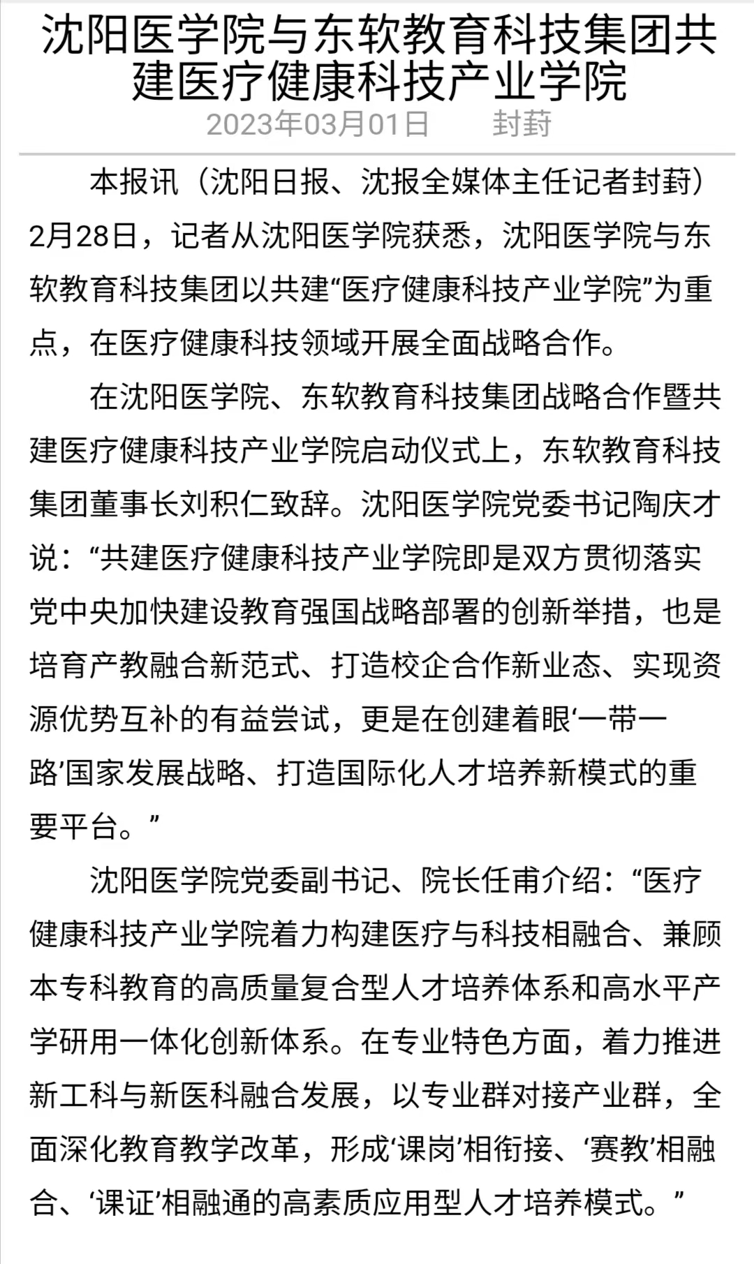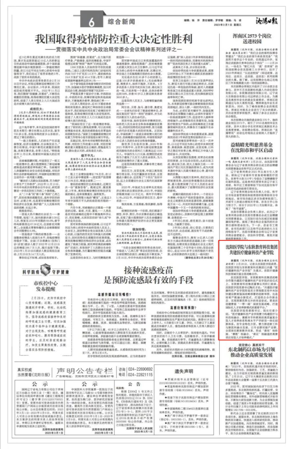 沈阳日报:米兰milan官方网站与东软教育科技集团共建医疗健康科技产业学院