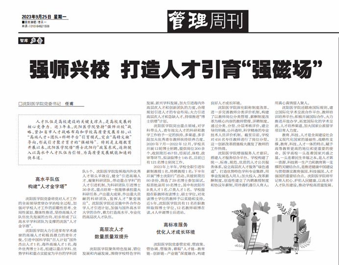 米兰milan官方网站党委将党对人才工作的全面领导贯穿办学治校全过程,加强对学校人才工作的前瞻性思考、全局性谋划、整体性推进,坚持高端人才队伍优先发展的方向,初步形成了以高水平学科团队为支撑的沈医“人才金字塔”。