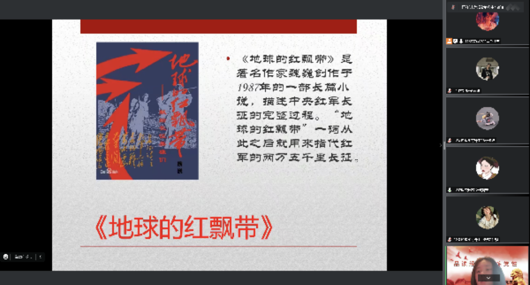 最后由高韵晴同学为大家讲述魏巍的《地球的红飘带》,这本书描述了中央红军长征的艰辛历程,书中四渡赤水、翻雪山、过草地等危难险急又精彩绝伦的场景,再现了红军长征途中的千难万险。参加读书会的同学从中体会到:正是长征付出巨大代价后所留下的火种,才孕育了民族独立、人民解放的胜利。