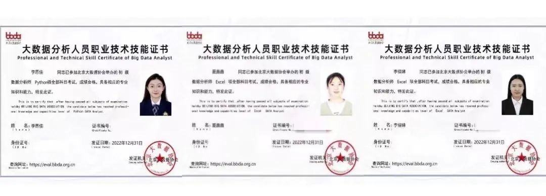 北京大数据协会为米兰在国赛中荣获一等奖的李思佳、夏鑫鑫、李佳娣3名同学颁发了初级数据分析师技能证书。