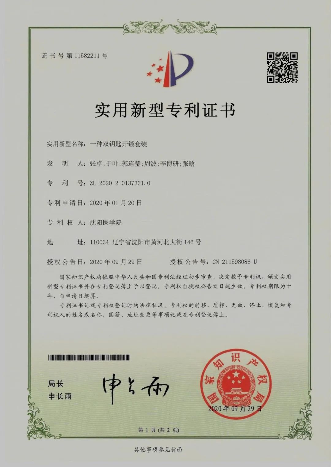 近日,米兰公共卫生学院张卓副教授发明的“一种双钥匙开锁套装”和“一种金属防火门静电消除门把手”两项专利成果成功实现转化。米兰作为专利权人与沈阳安达友信科技有限公司成功签订技术转让(专利实施许可)合同,转让费用共计4万元。